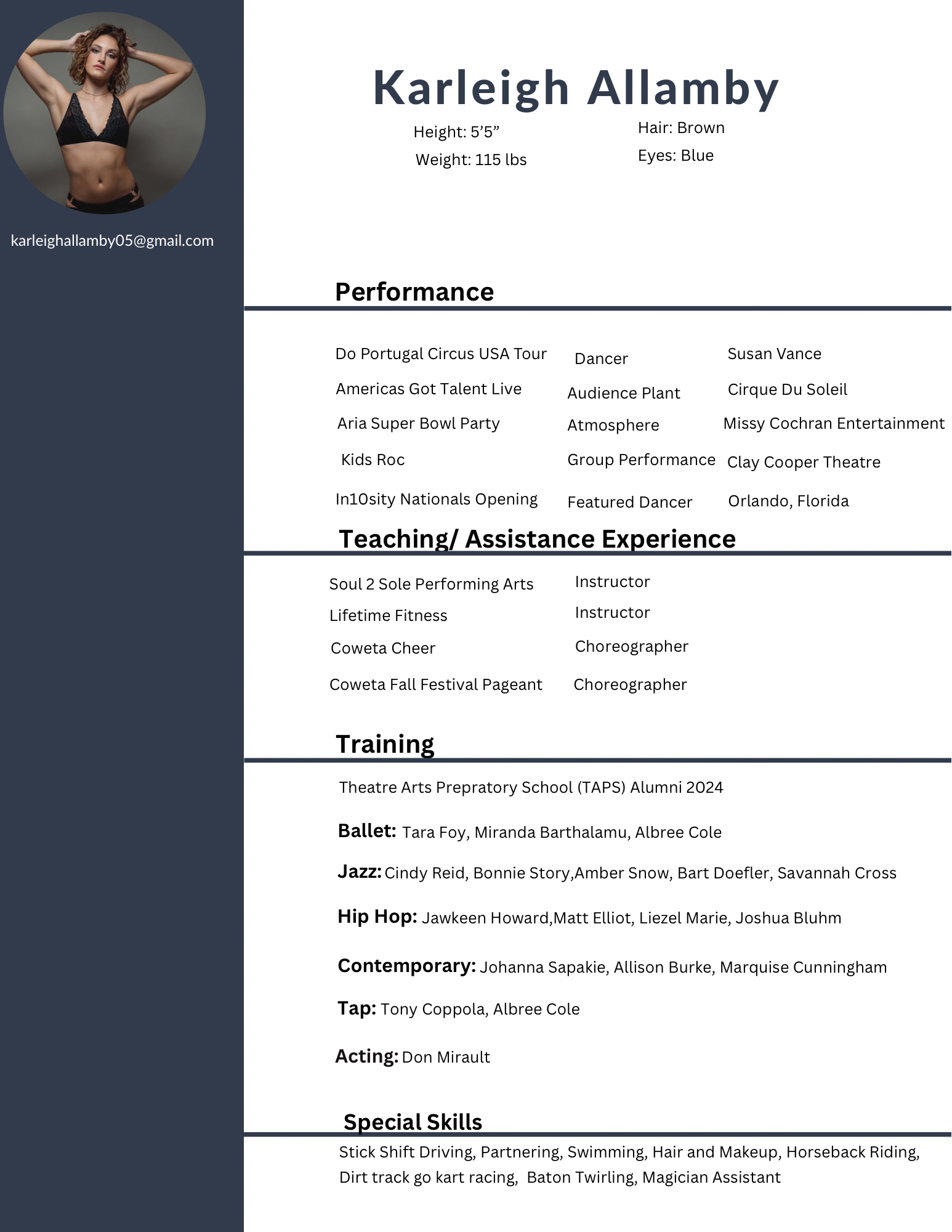 Karleigh is a professional entertainer currently employed by RWS Global, serving as the Global Company Manager for Curse of the Comet. She recently spent several months traveling the east coast on tour with Do Portugal Circus. She has worked as an audience plant for America’s Got Talent Superstars Live, as well as for Missy Cochran Entertainment as a model. She has performed at the Clay Cooper Theater in Kidz Roc. She started dancing at age five and hasn’t stopped. Her continuous training involves ballet, tap, jazz, hip hop, contemporary, musical theater, singing and acting. Karleigh is a 2024 graduate of Theater Arts Preparatory School in Las Vegas under the direction of Don Mirault.